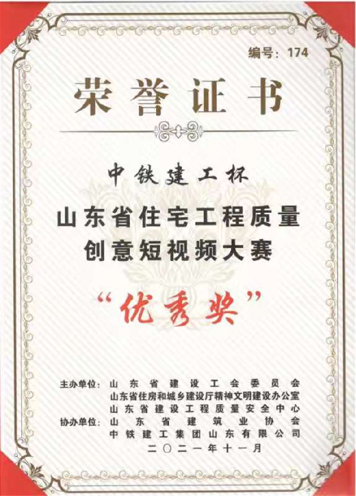 由山东省建设工会委员会、山东省住房和城乡建设厅精神文明建设办公室、山东省建设工程质量安全中心联合举办的山东省住宅工程质量创意短视频大赛,我公司制作的《滨州项目质量控制视频》获得了优秀奖的好成绩。....